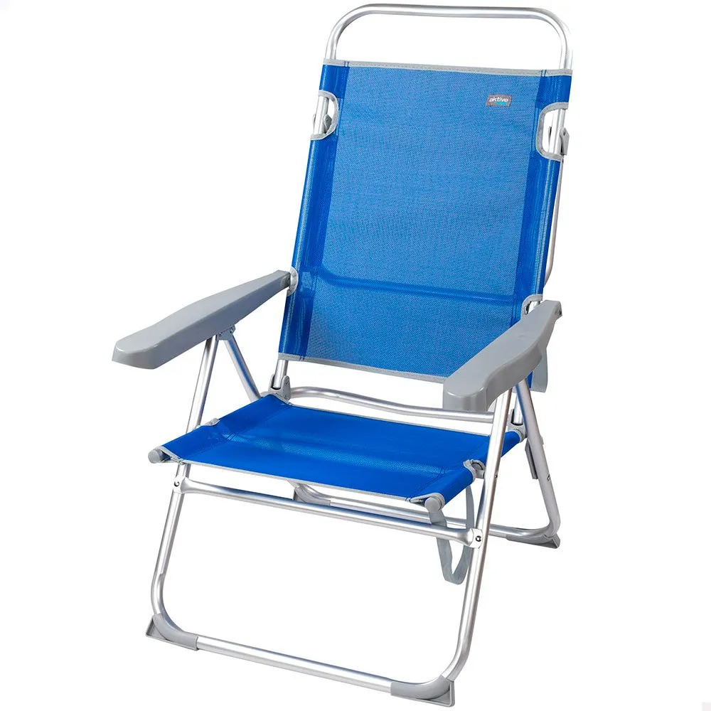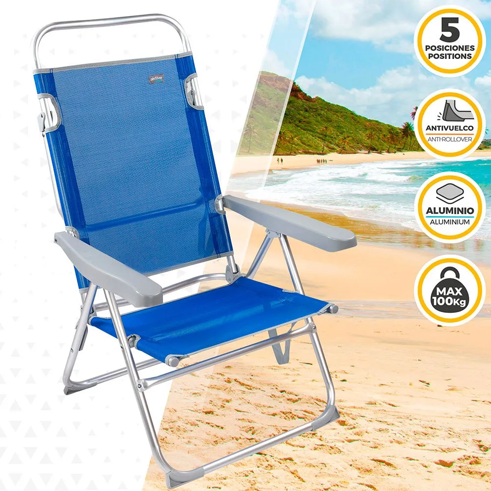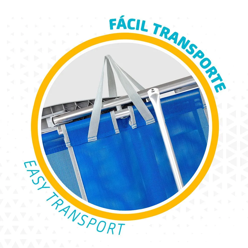 Made with a resistant aluminum structure and a textilene seat, it measures 63x57x99 cm, with anti-roll blocks to place on any surface and maintain stability.