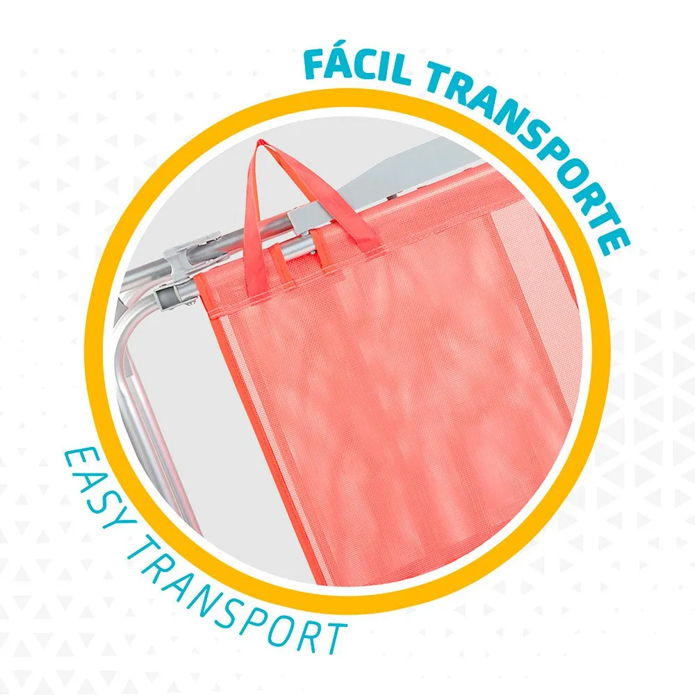 Aktive Beach high chair with fixed position folding in coral color and measures 56x50x88 cm, made with a resistant aluminum structure and a waterproof, washable and weather resistant textilene seat, supports a maximum weight of 100 Kg, with anti-tip blocks that provide stability in any surface.