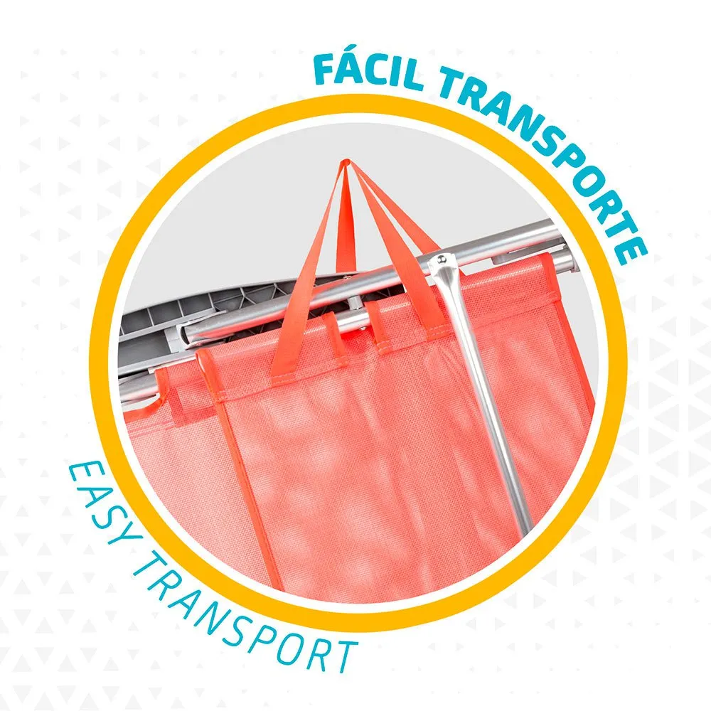 Made with a resistant aluminum structure and a textilene seat, it measures 63x57x99 cm, with anti-roll blocks to place on any surface and maintain stability.
