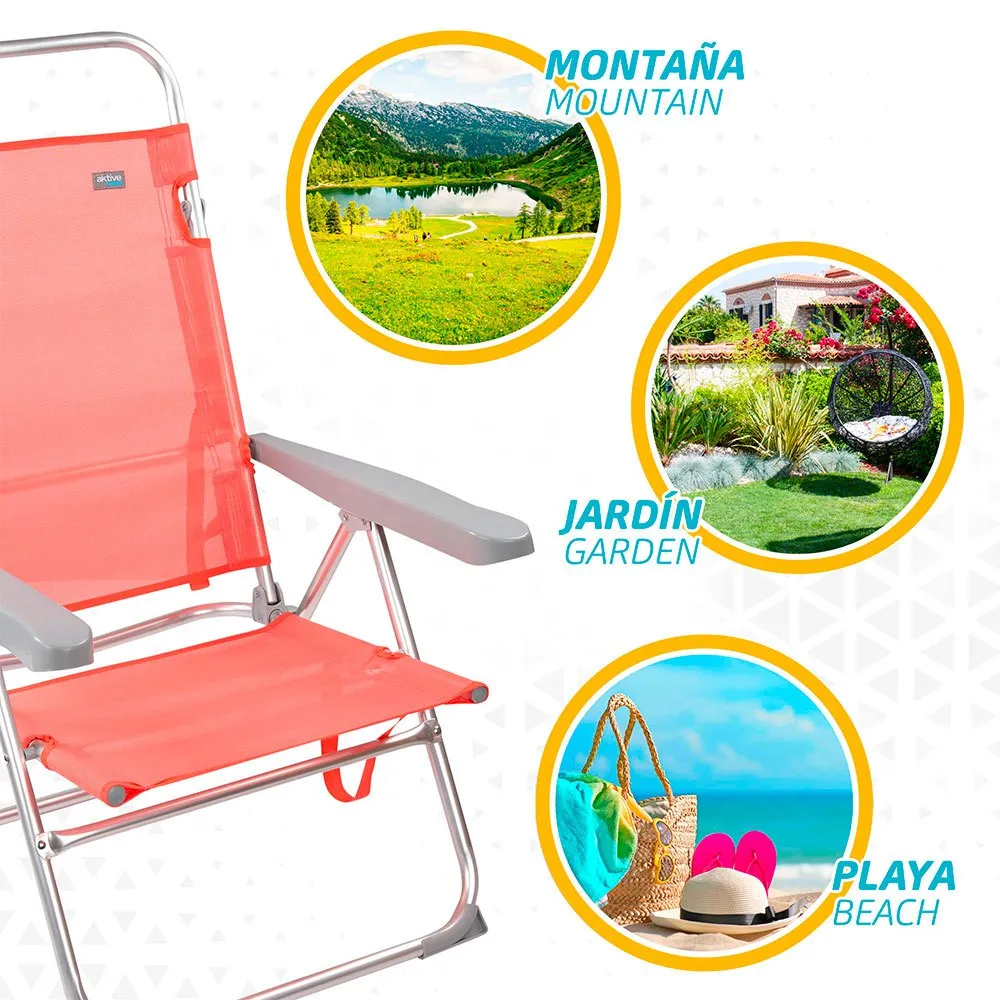 Low folding chair with adjustable 5-position reclining backrest with ergonomic armrests.
