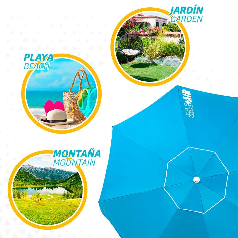 The umbrella is made of polyester material in blue with UV50 protection and silver interior lining, it also has a ventilation roof that favors air transmission.