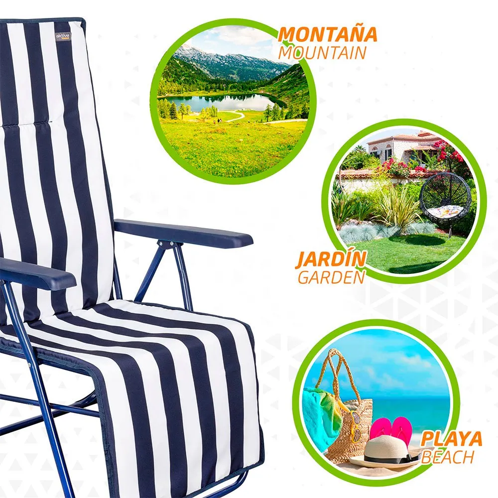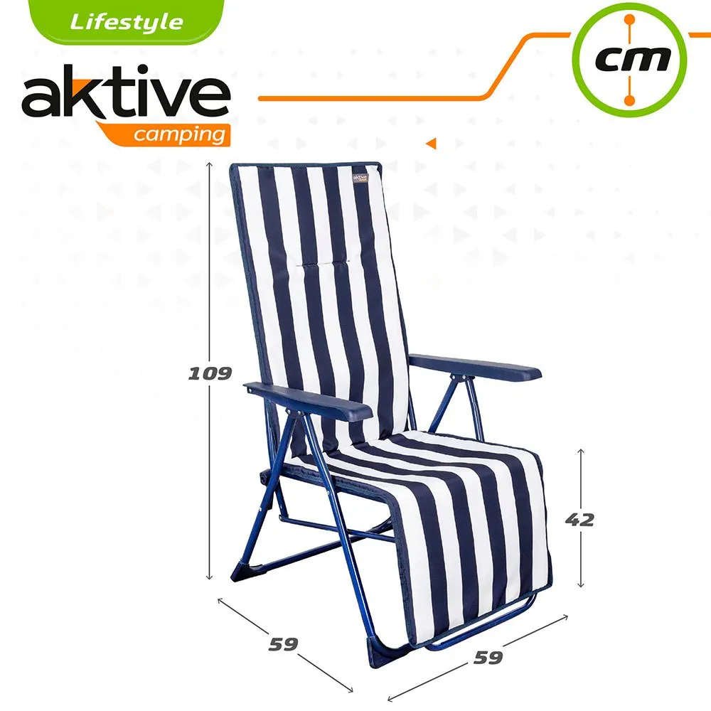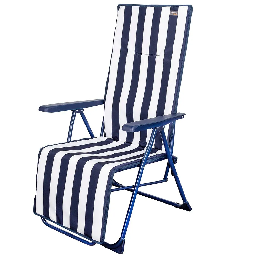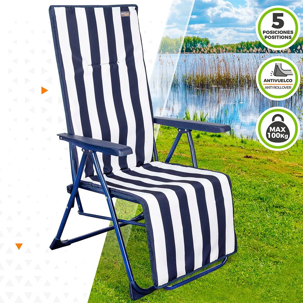 It folds completely and has 5 positions that you can adjust through the navy colored PVC armrests.
