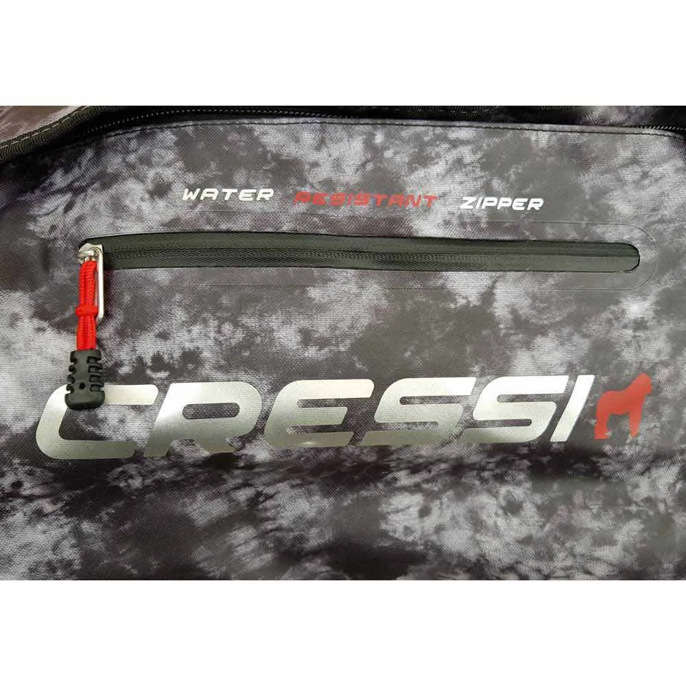 GORILLA PRO 2.0 is the evolution of the mythical Gorilla, the Cressi’s professional bag. It’s made with resistant thermo fused laminated Tarpaulin© PVC through 7 tenths thickness high frequency, so it’s practically 100% watertight and so, really useful to avoid wetting the boot of your car. It has two hard fused handles in each extreme, very useful to transport it, especially when the bag is really charged, and a handle-shoulder strap system with snap hooks and especially resistant accessories that allow very heavy burden (extreme resistance test until 145 Kg weight). The YKK© zip is made of plastic (as on the wetsuits) and it’s recovered by one Velcro© flap. U configuration for a wide opening of storage space, perfect access and comfort when inserting the equipment. It has an exclusive and practical drainage system of residual water in one of the extremes. It can be folded and disinserted to empty quickly the bag. Spare part plugs are available. Its dimensionsare perfect for complete equipment even adding the larger apnea or diving fins. Its square section highly increases the capacity regarding the previous version.