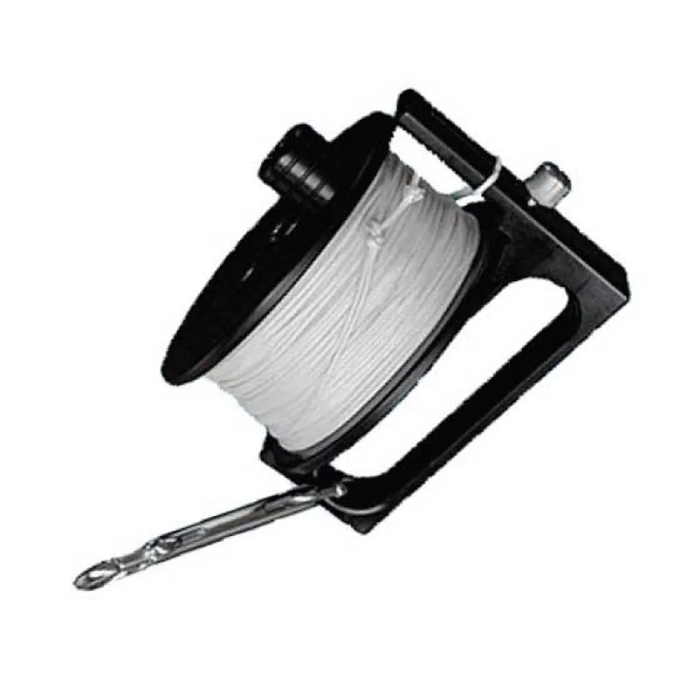 Technical fishing reel of robust construction that combines duralumin and Delrin with assembly elements in stainless steel AISI 316. 130 mts capacity (it includes white rope of 2mm diameter). It includes double sulphurous snap hook. Stainless steel AISI 316 screws. Fixation system through a little sphere that allows lacing over itself to be able to fix it for example at medium height of anchor rope. Stainless steel mechanism that, joined to the aluminum body and to the roller’s Delrin, ensures a great structural rigidity, essential to avoid erosion or blocking. Calibrated rope to obtain great relationship flexibility-body-weight and make it stable while rolling and unrolling. Adjustable brake system to avoid the excessive freedom of the reel on emptying stage and also avoiding to release unreasonable thread. Integrated lace between the roller and the reel’s body, without slots or gaps that could cause the escape of the line or to remain clamped.