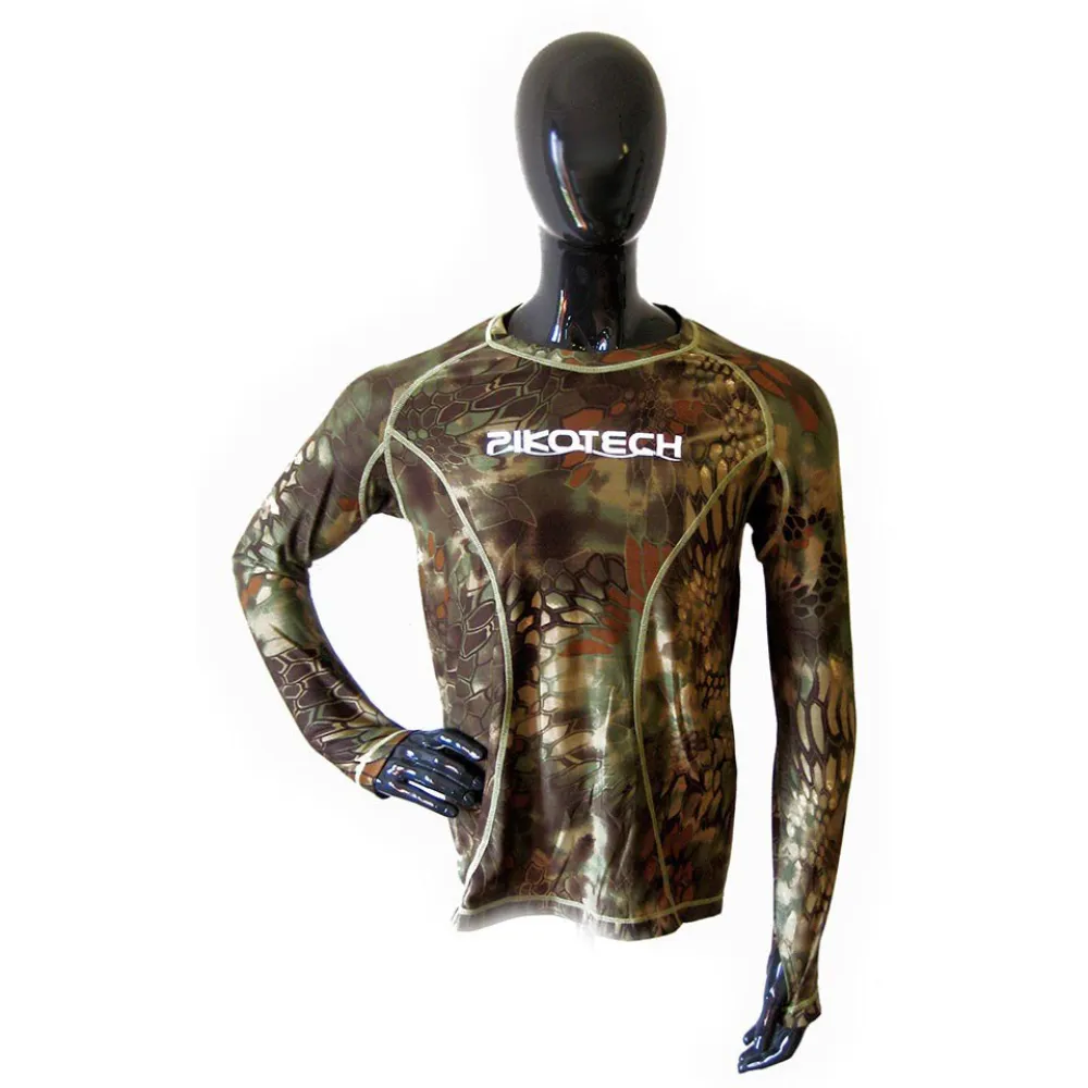 Polyester shirt for wetsuit covering with camouflage coloring suited for rocky seabed.
