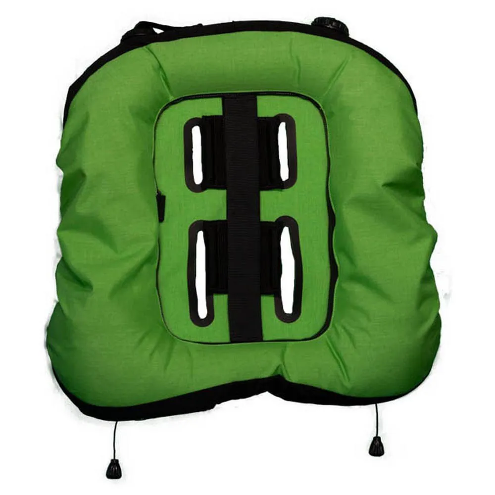 The Deep Ocean 2.0 Hybrid Wing is made in a donut-style with internal bungees and can be used with single or double tanks! It has a single inflator with a corrugated hose connected to a non dumpable elbow connector uniquely attached in the top left position. On the top right is an over pressure valve with an adjustable length cord and knob. There are two dump and over pressure valves located on the front lower left and right side. In addition to the built in single tank adaptor is a tank protection strap attached with Velcro. The outer wing bladder is made with a 1,000 denier nylon exterior and TPU laminated liner inside to avoid punctures, tears or deterioration from salt water or chlorine. The inner bladder is made of polyurethane material and its seams are ultrasonic welded. The grommets are reinforced with a second ring of material to eliminate potential weak points for wear or tear. It is made for double or single tank use and has an adjustable lift capacity from 45lbs (20kg) – 60lbs (27kg) simply by adjusting the internal bungees and comes in multiple colors.