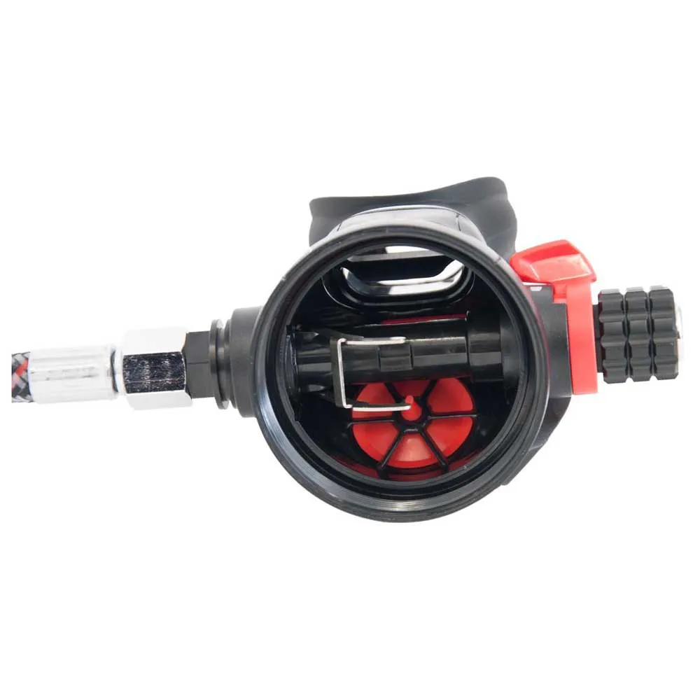 The Evoque Balanced Adjustable Second stage is compact and designed to give superior quality of breathing to any diver. The balanced diaphragm is securely held down by a ring and inner cover that screws down below the front cover and purge button. The exhaust has a small hinged door allowing easy access to the diaphragm to clear any debris. This exhaust used with our Tattoo Mask or similar will allow all the exhaust gas and bubble to pass its side and not in front of the mask. The adjustment knob has a clutch system when turning clockwise to avoid over torqueing. Next to the adjustment knob is a large pre dive and dive venturi switch easily adjusted with or without any size glove. The inner valve is made of stainless steel parts providing excellent breathing in any environment or temperature. Octopus available with a high visibility yellow coloRed cover.