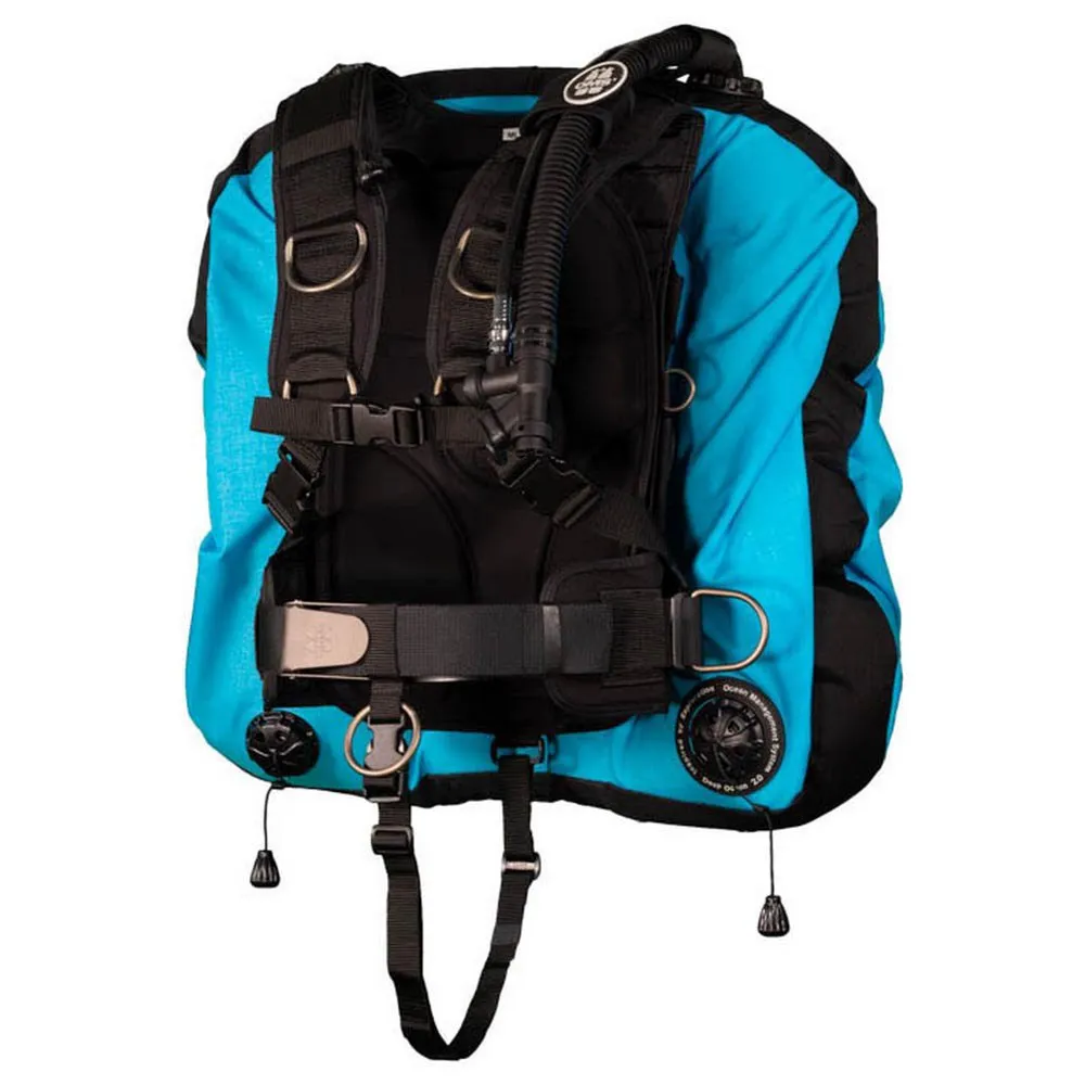 The Deep Ocean 2.0 Hybrid Wing is made in a donut-style with internal bungees and can be used with single or double tanks! It has a single inflator with a corrugated hose connected to a non dumpable elbow connector uniquely attached in the top left position. On the top right is an over pressure valve with an adjustable length cord and knob. There are two dump and over pressure valves located on the front lower left and right side. In addition to the built in single tank adaptor is a tank protection strap attached with Velcro. The outer wing bladder is made with a 1,000 denier nylon exterior and TPU laminated liner inside to avoid punctures, tears or deterioration from salt water or chlorine. The inner bladder is made of polyurethane material and its seams are ultrasonic welded. The grommets are reinforced with a second ring of material to eliminate potential weak points for wear or tear. It is made for double or single tank use and has an adjustable lift capacity from 45lbs (20kg) – 60lbs (27kg) simply by adjusting the internal bungees and comes in multiple colors.