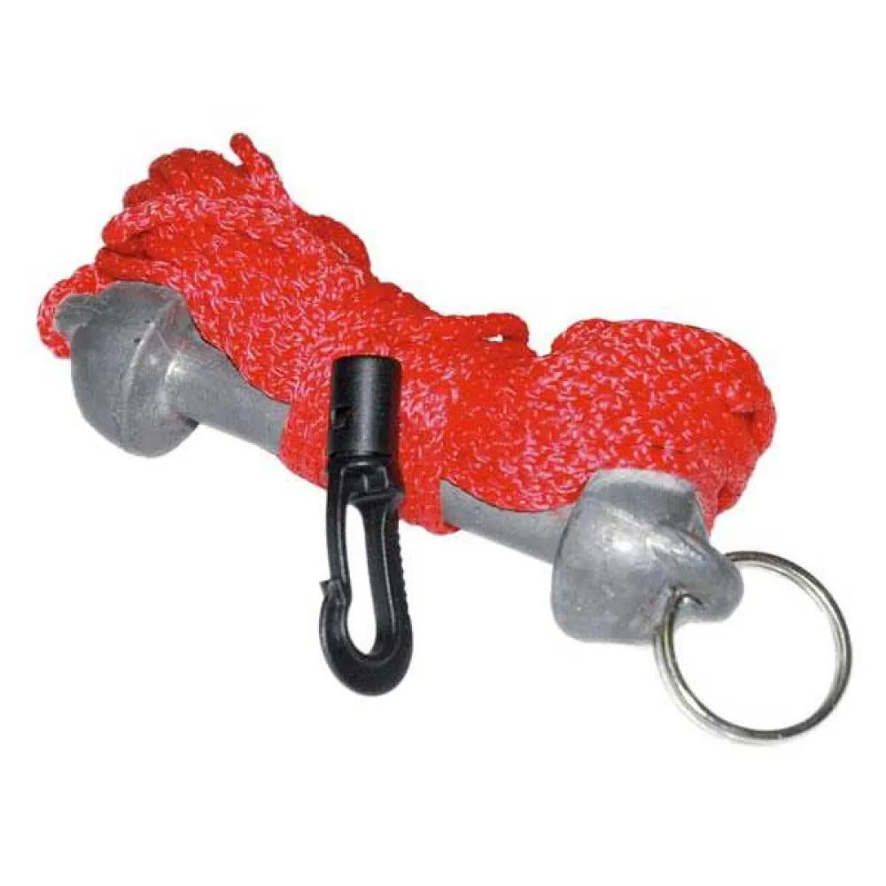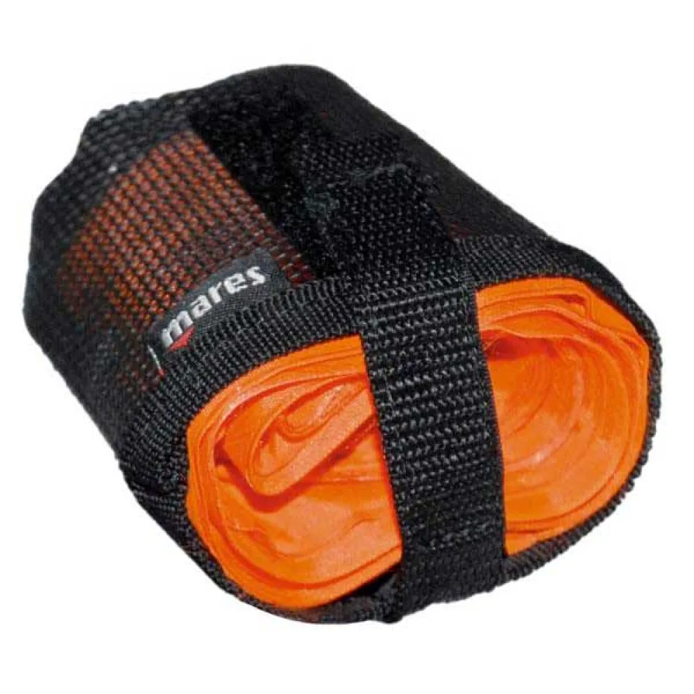 A mesh nylon sack equipped with a fastening carabiner contains the marker buoy, line and a weight with a special shape to easily wind up the line.