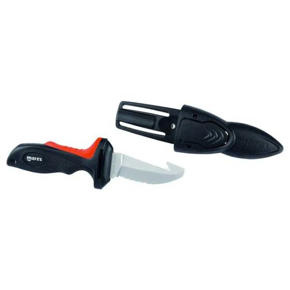This compact knife is ideal for any situation. A series of standard accessories makes it easy to fasten the knife to Mares BCDs, bags, and hoses. The grip features soft overmolding for a secure hold.