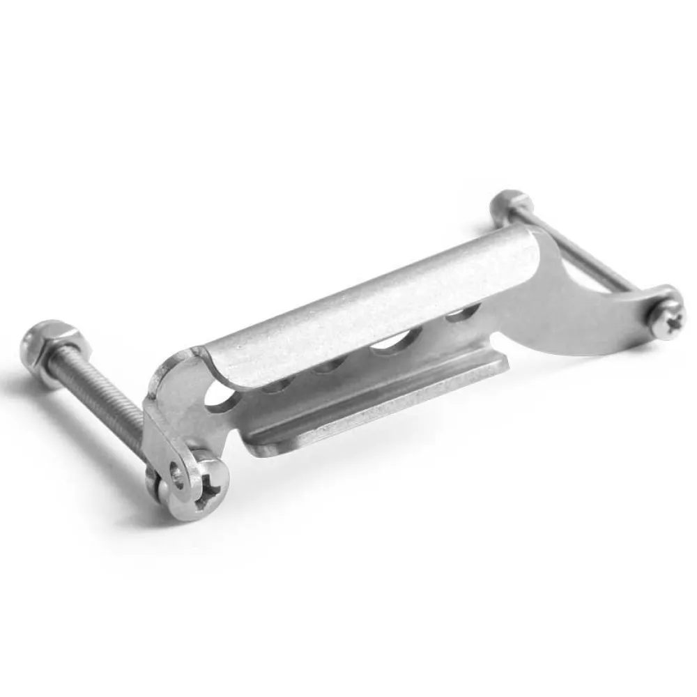 Steel bracket to be fixed to the handle of the speargun and aluminum barrel on which to fix the camera. The arm can be moved quickly from one bracket to another. The final part of the arm can be tilted to easily load the speargun.