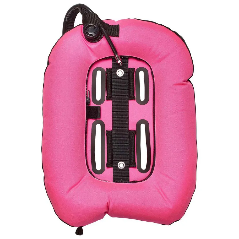 The wing has a an inflator integrated pull dump OVP at the left shoulder and an OVP at the left hip and has two bladders, the outside bladder has a TPU laminated liner.