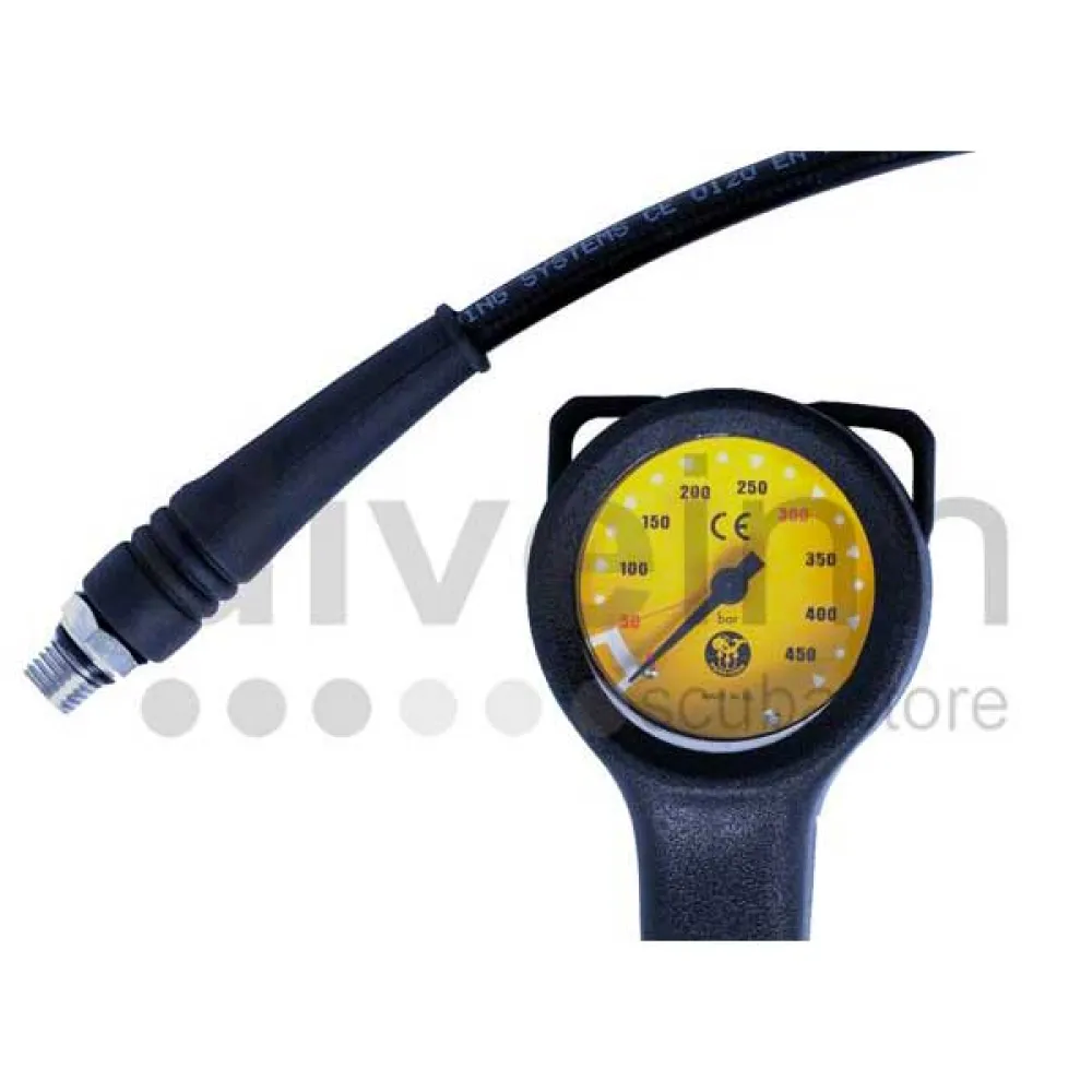 This 300 bar (4350 psi) pressure gauge is a small model that will not be in the way during the dive. Made of robust metal. With Poseidon’s 300 bars kevlar reinforced hose.