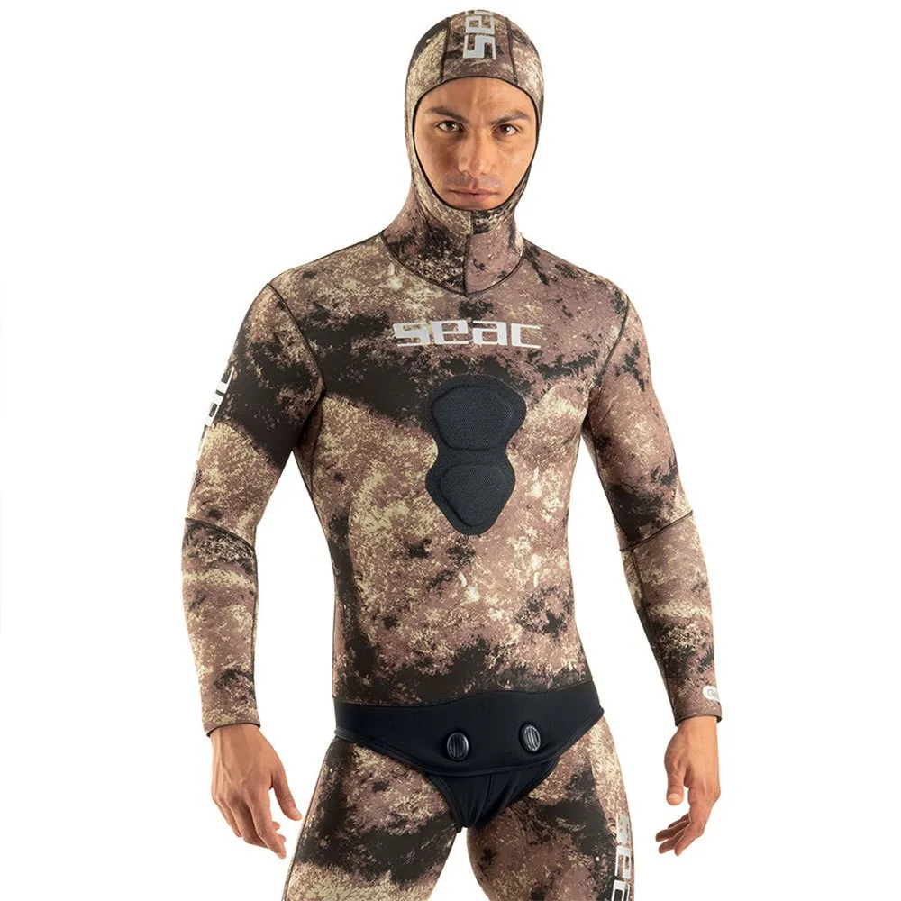 Seac Gannet hooded jacket in 7 mm soft Stretch neoprene with SEAC® exclusive camouflage fabric in shades of brown.