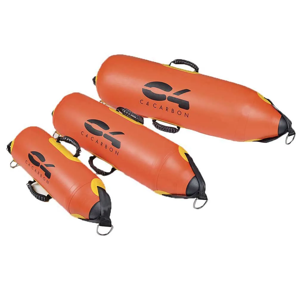 The torpedo buoys are made with 0.7mm PVC and feature two handles on the sides, a handle on the back, 2 stainless steel D-rings and a swivelling carabiner.